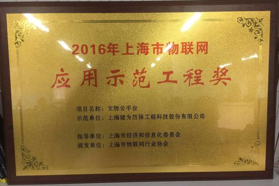 ? ? ? ?2017年5月17日,上海市临港经济发展(集团)有限公司与上海市物联网行业协会全面合作签约仪式暨上海市物联网联合开放实验室揭牌仪式在宝山区新业坊召开。临港集团副总裁翁恺宁、物联网行业协会会长蔡小庆、宝山区区长范少军、市经信委副主任傅新华发表了重要讲话。宝山区副区长吕鸣、临港集团总裁袁国华以及相关领导出席会议。会上,建为历保独立研发的“文物云平台“凭借其平台成熟度、技术先进性、市场广阔性、行业示范性等优势,从上海市众多优秀物联网平台中夺颖而出,获得上海市经济和信息化委员会认定的、上海市物联网行业协会颁发的“2016年上海市物联网应用示范工程奖”。